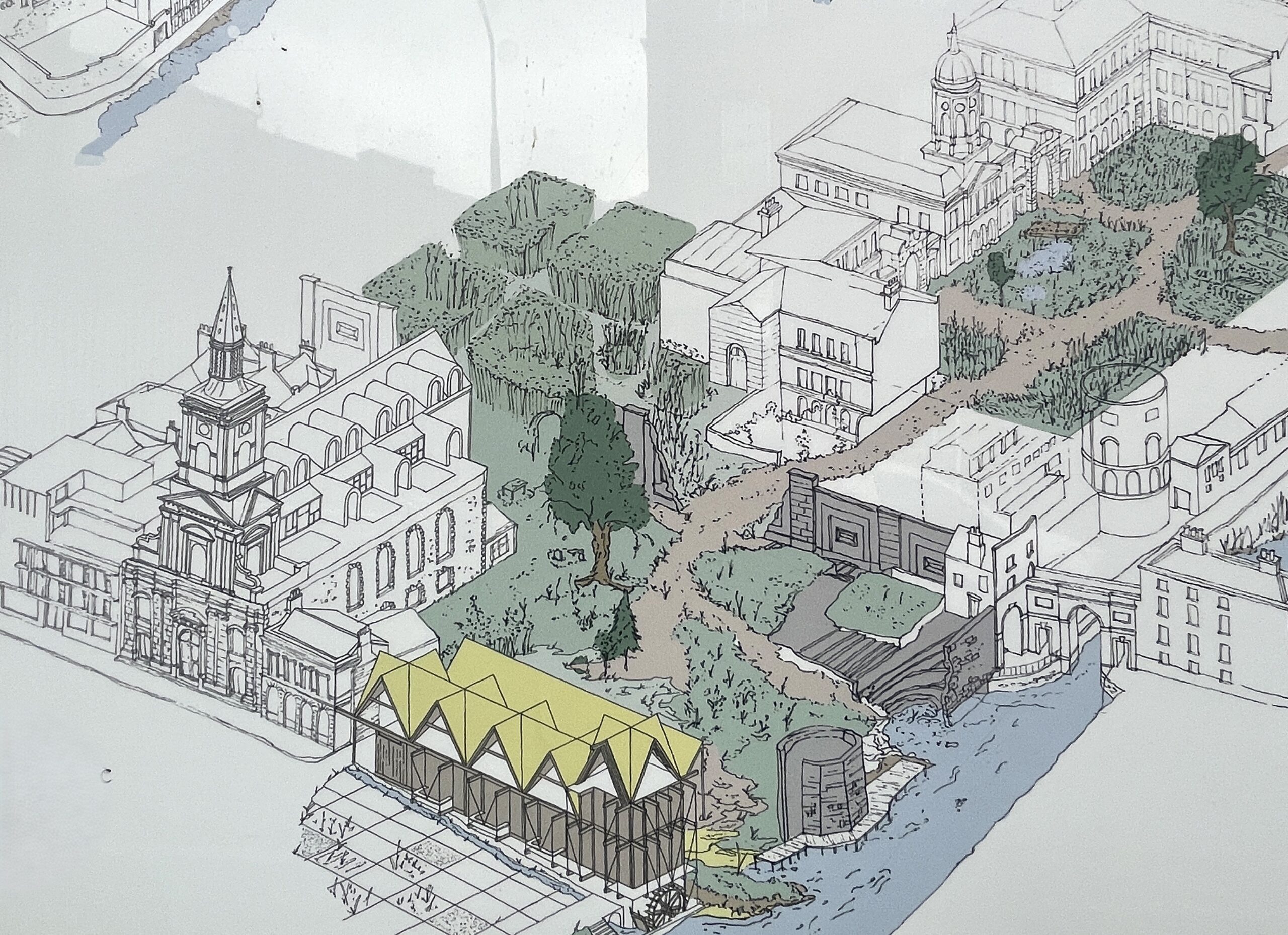 The beautiful illustrations evoke a site that has been at the heart of the city since Dublin was founded as a Viking port. A point where the water of the Poddle as it approaches the River Liffey was harnessed to power mills to serve the adjoining settlement. And images show how the area developed as the Viking settlement became an Anglo-Norman walled city. A sheep market here gave its name to Sheep Street, that in turn was corrupted to Ship Street – the name we know the street as today.